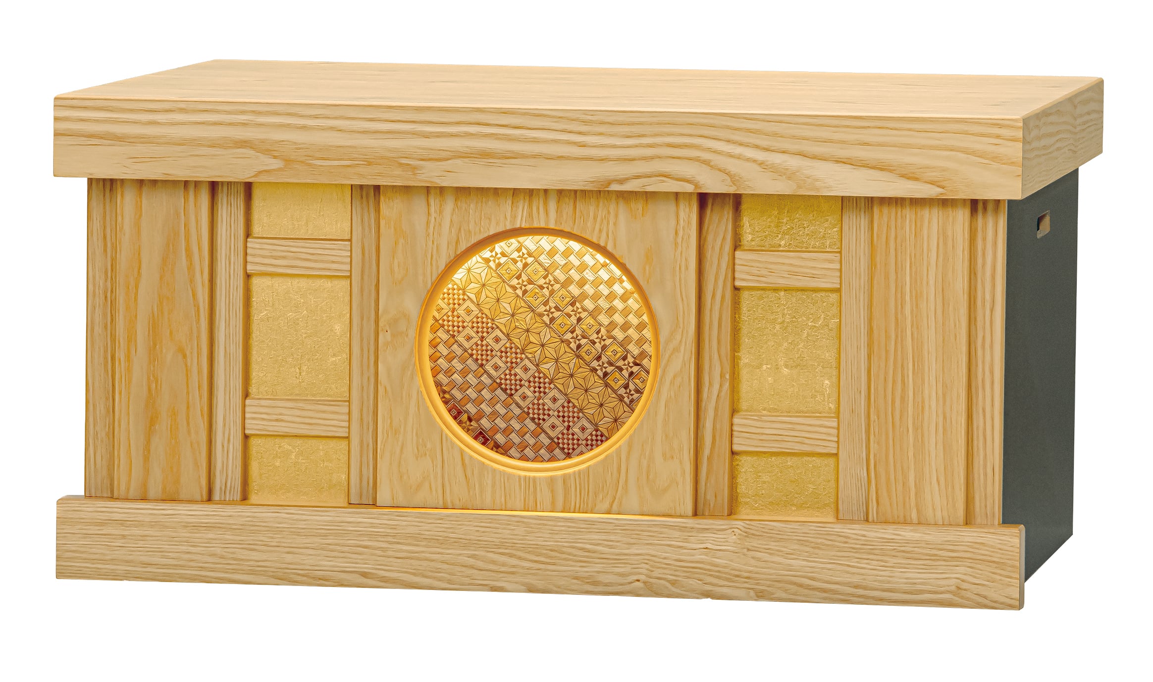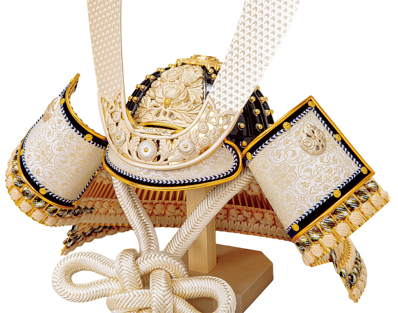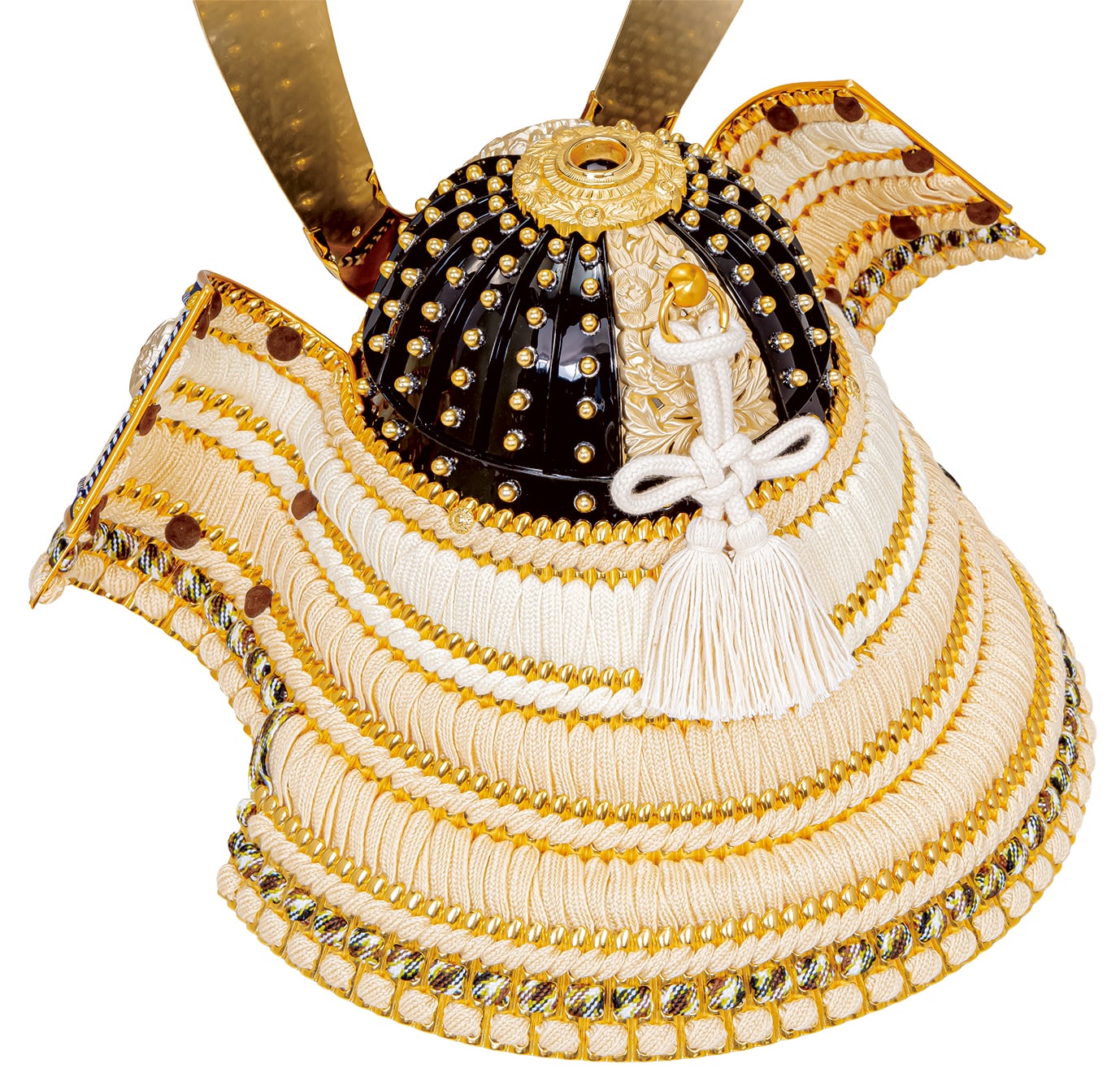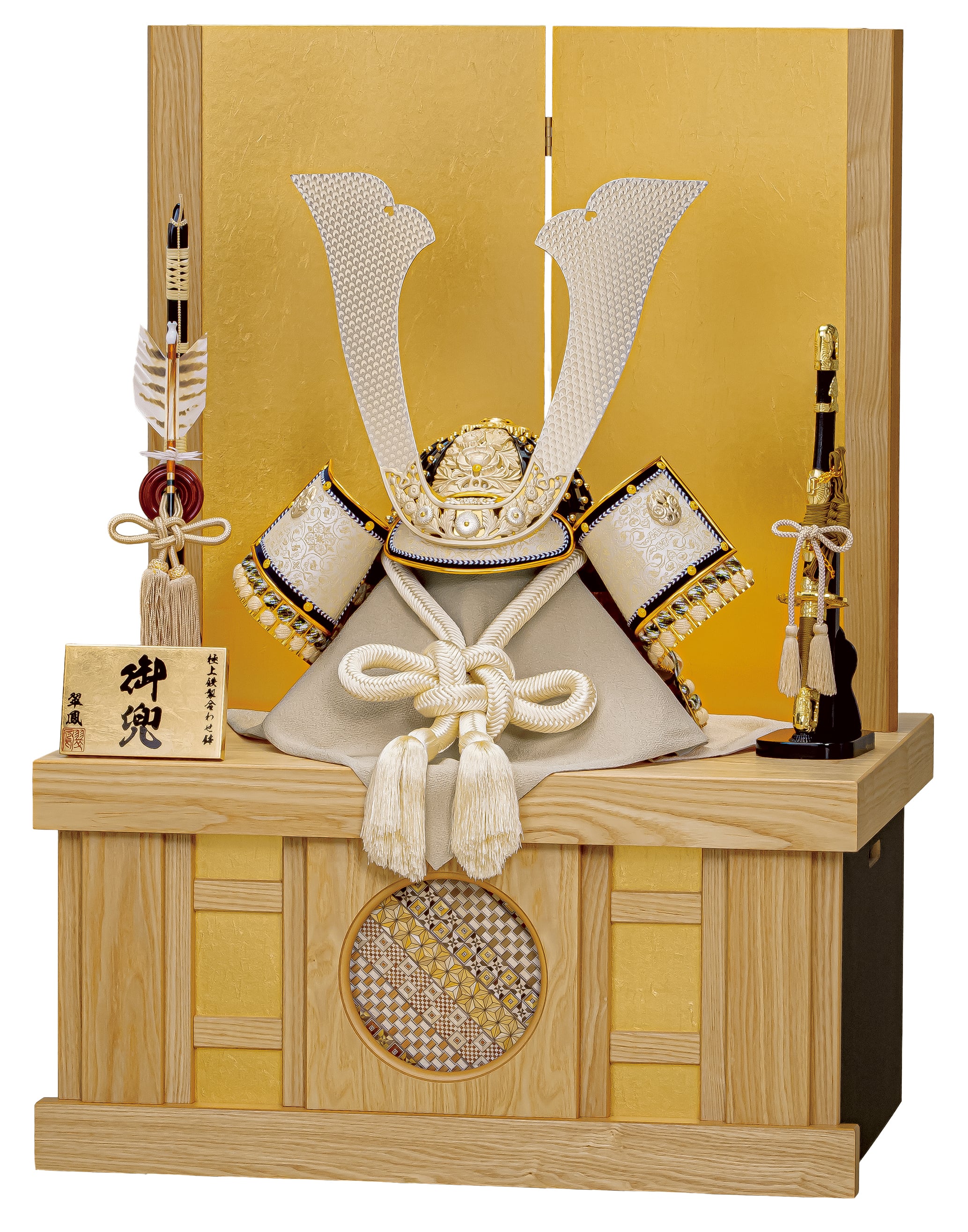 とても綺麗に仕上がったアイボリーホワイトからーの兜。被ることが出来る25号永都兜です。白木木目の家具調に仕上げた収納箱には、寄木細工の部分に灯りが点るようにデザインしました。