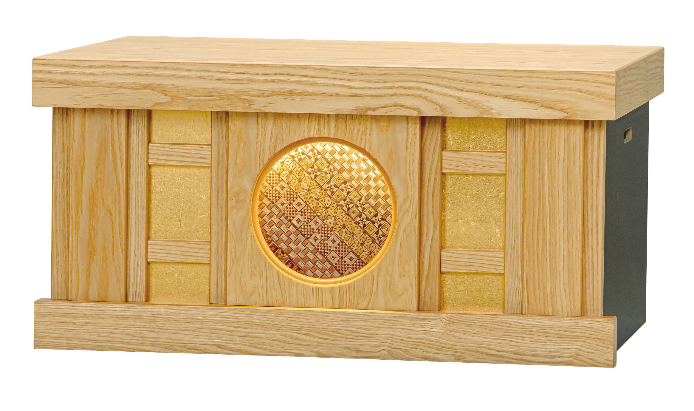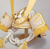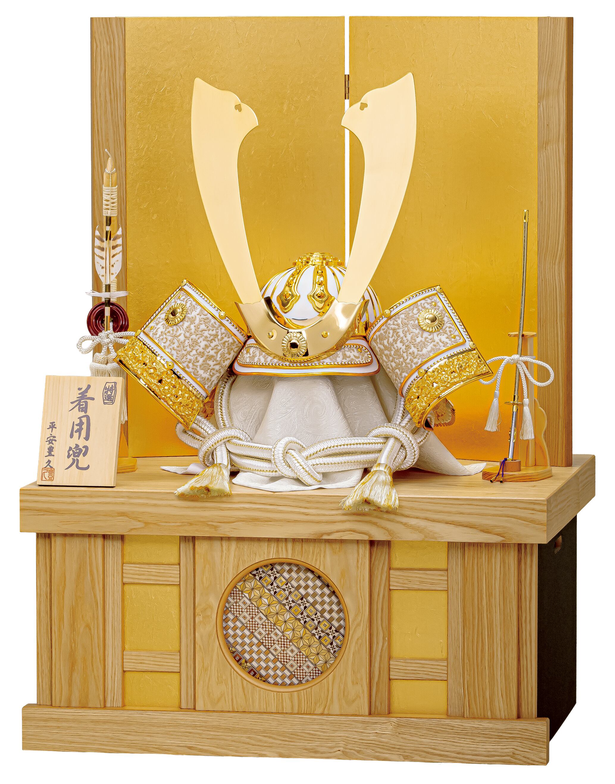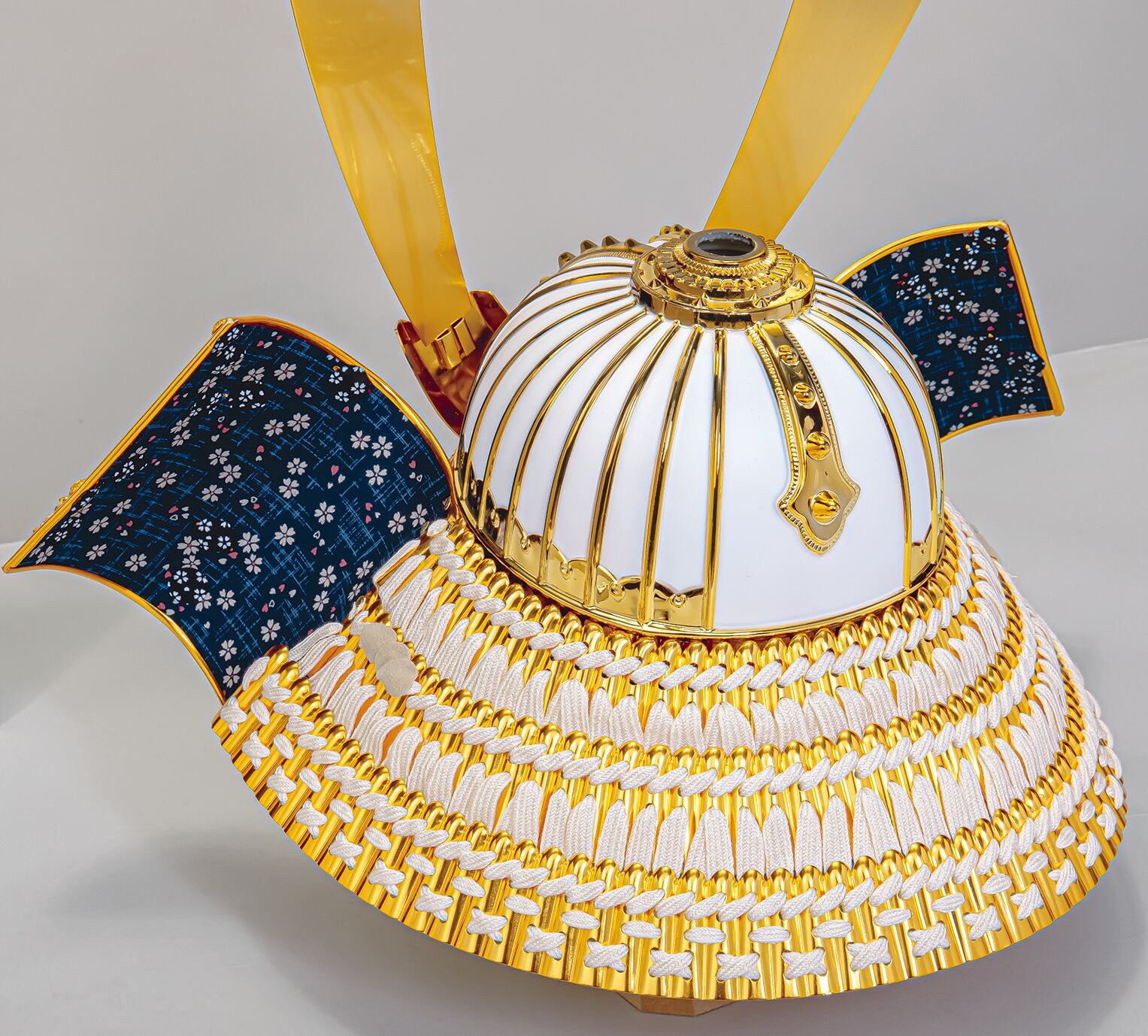 ゴールド仕立ての兜を白色の糸で編み上げた、力強い兜が出来上りました。寄木細工の部分に灯りが点る、家具調に仕上げた収納箱と屏風の相性もぴったりです。