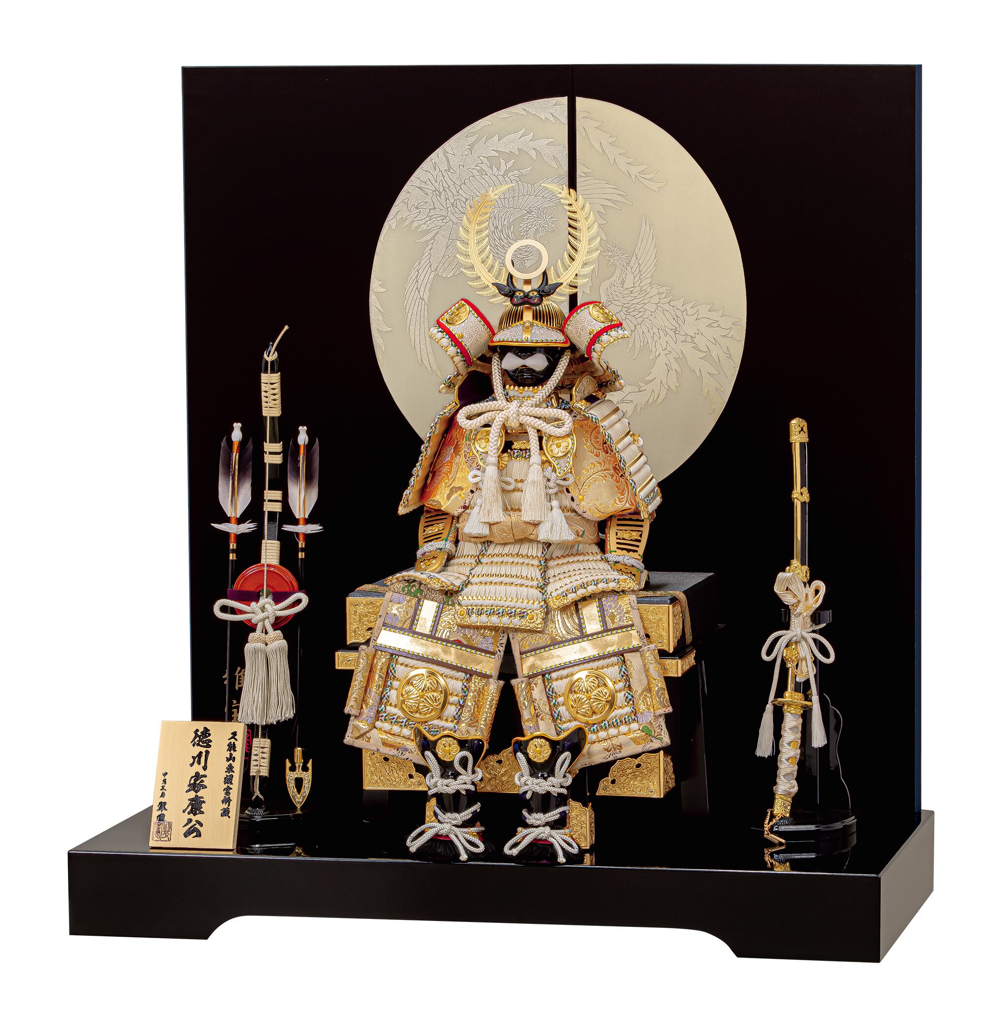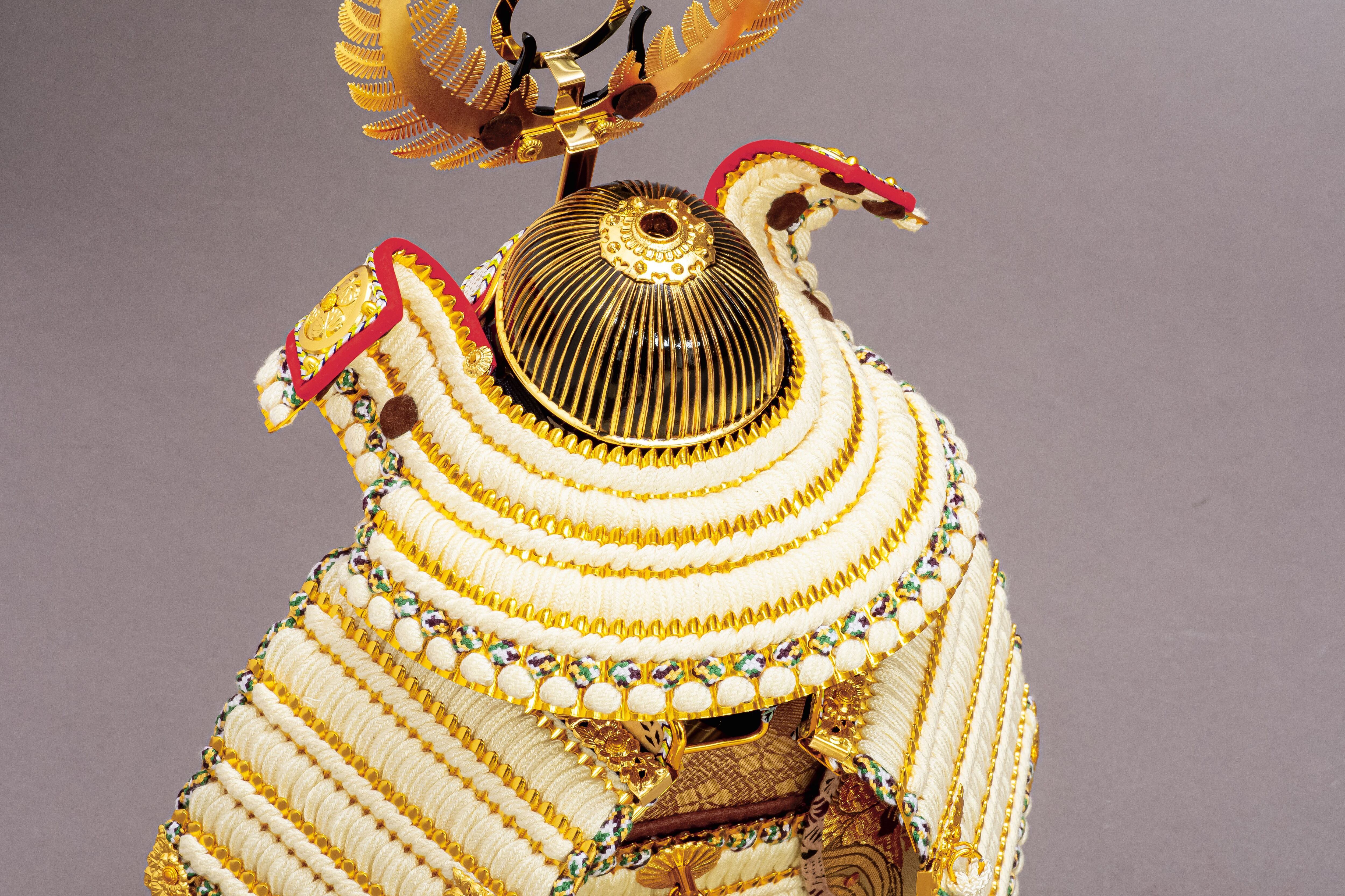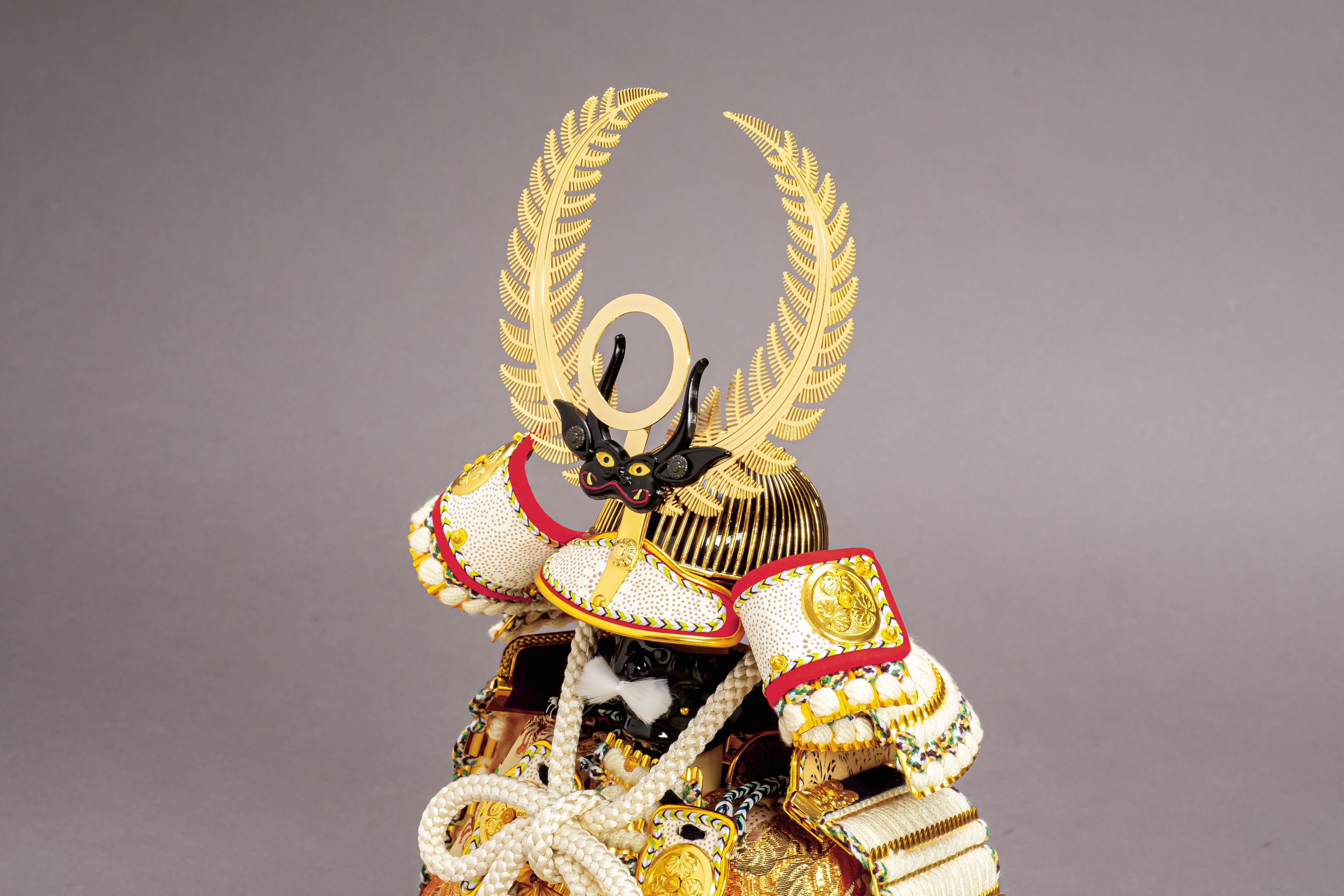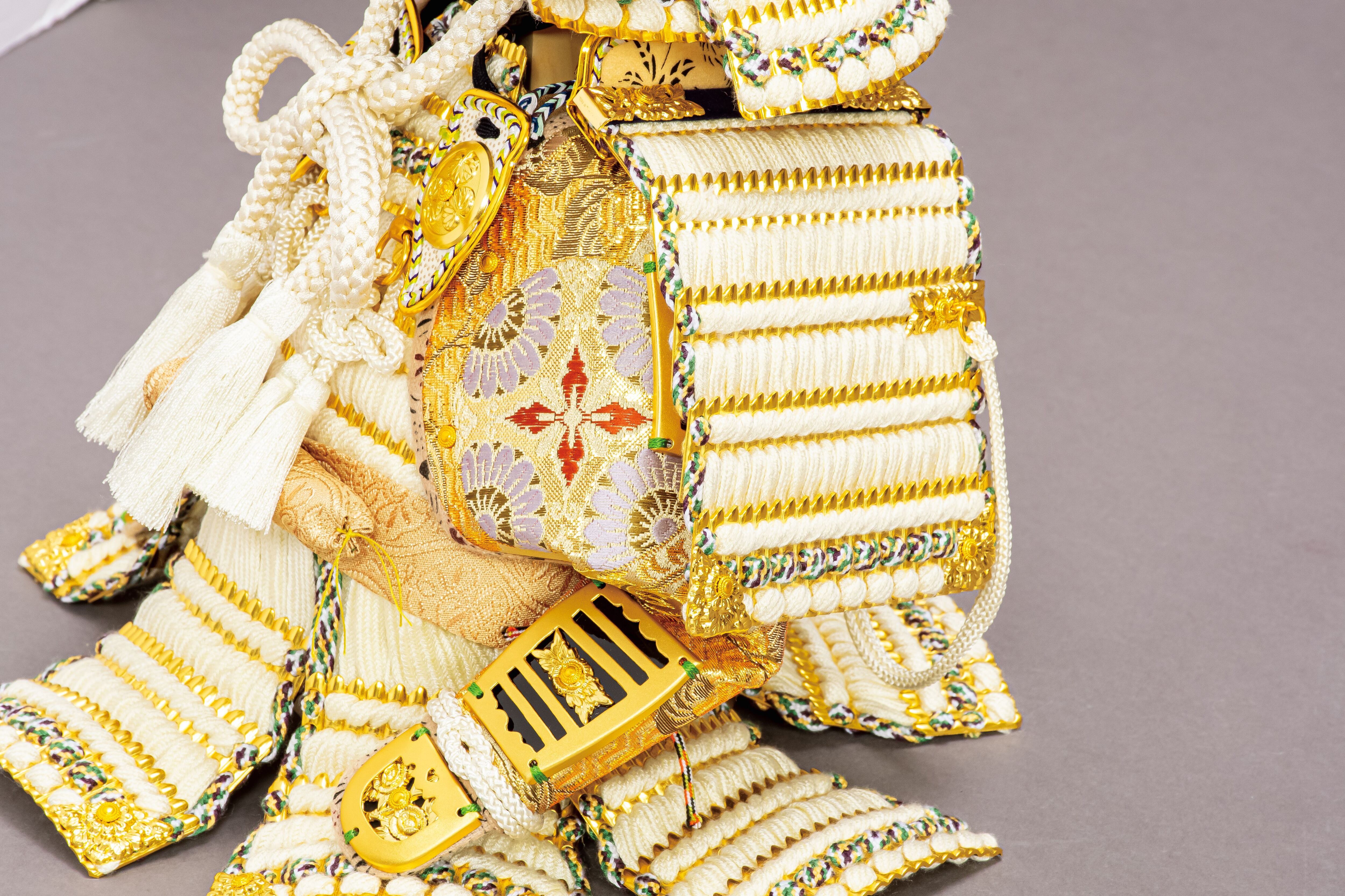 ブラックシルクの二曲屏風にひときわ映えるこの白い鎧は、7号サイズで製作した徳川家康公の鎧飾りです。7号サイズはコンパクトでありながら、十分に満足感を味わうことのできる大きさに仕上がっているおすすめの逸品です。
